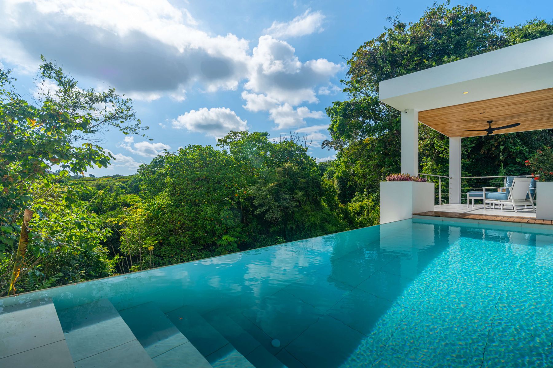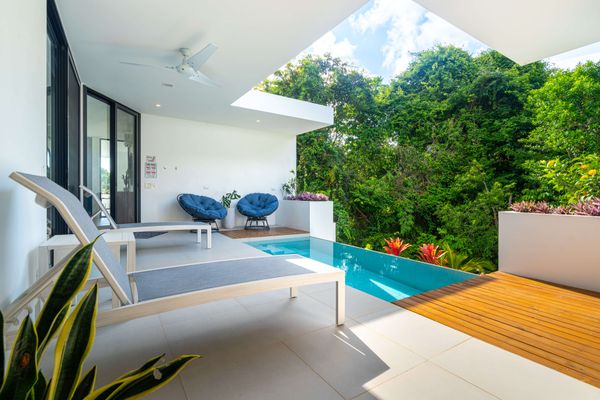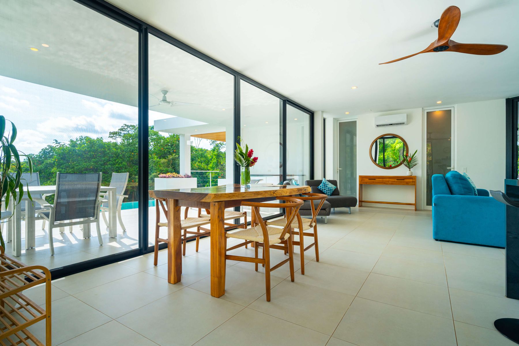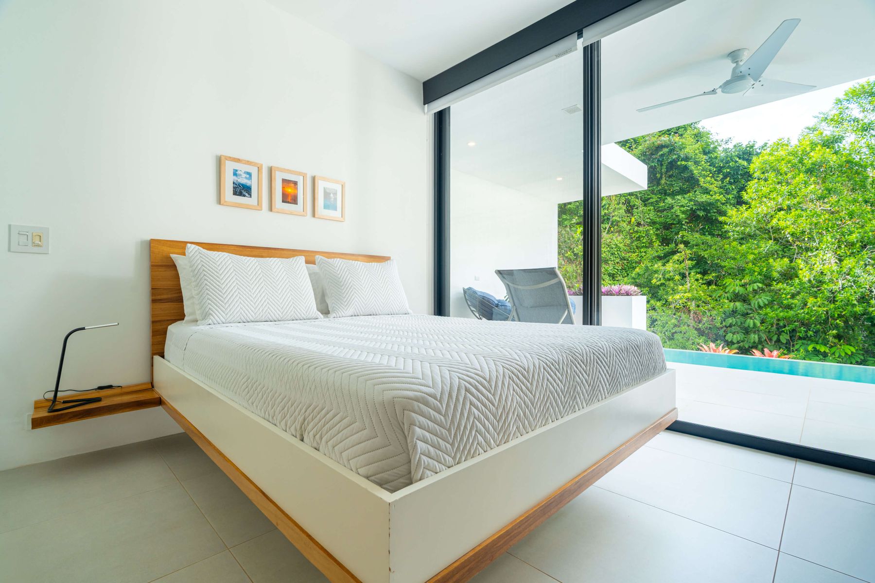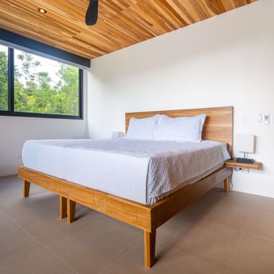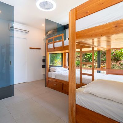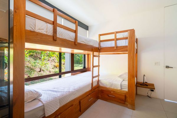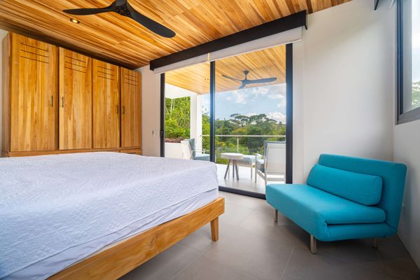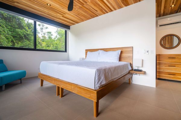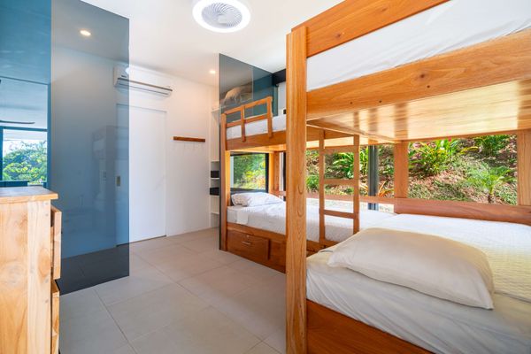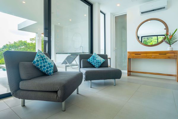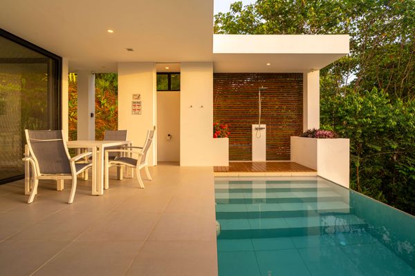 Each bedroom includes air conditioning for comfort. The open living area flows directly to the outdoor terrace where guests can enjoy two beautiful infinity pools, perfect for relaxing and cooling off while surrounded by jungle and mountain views.