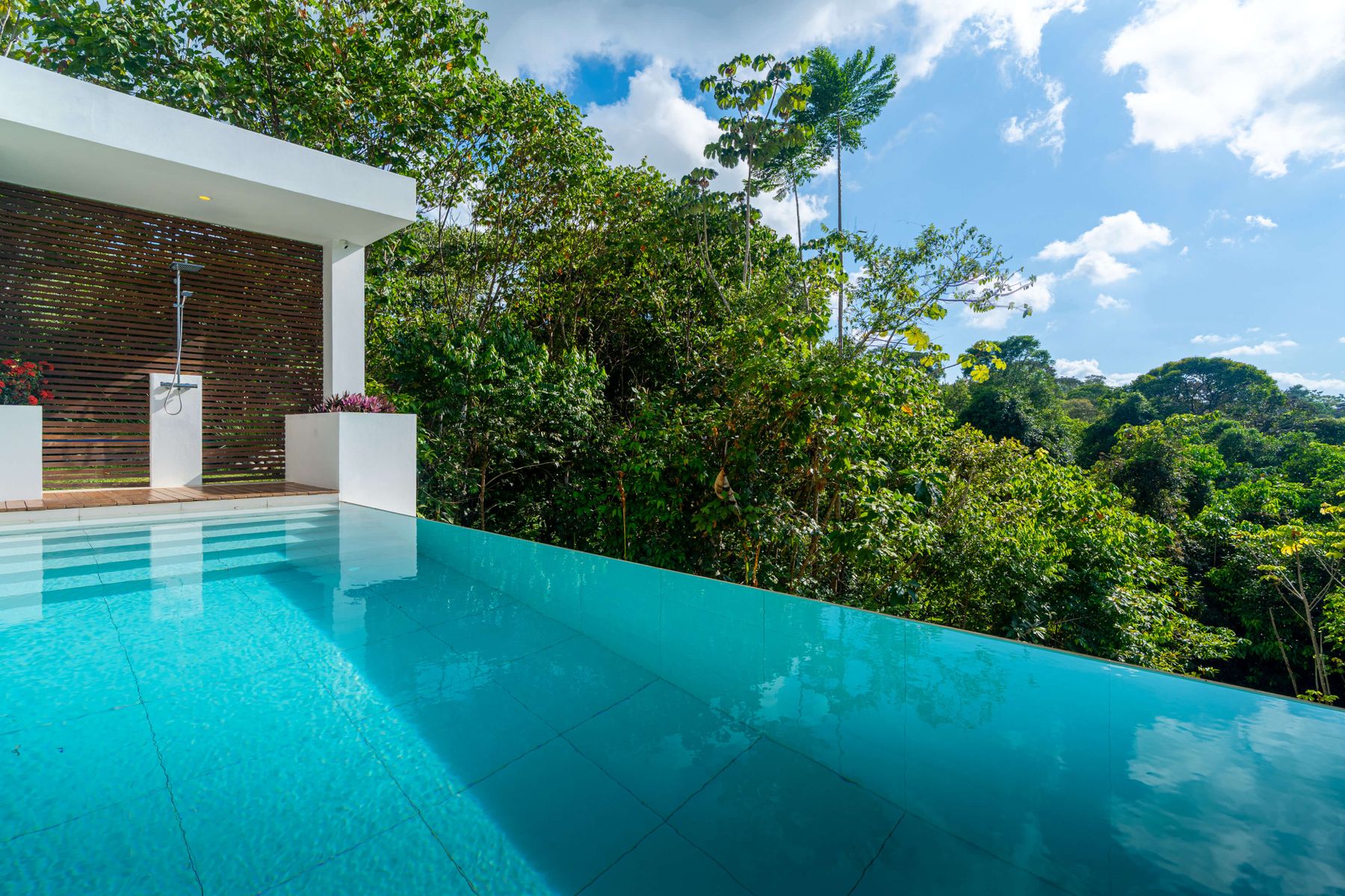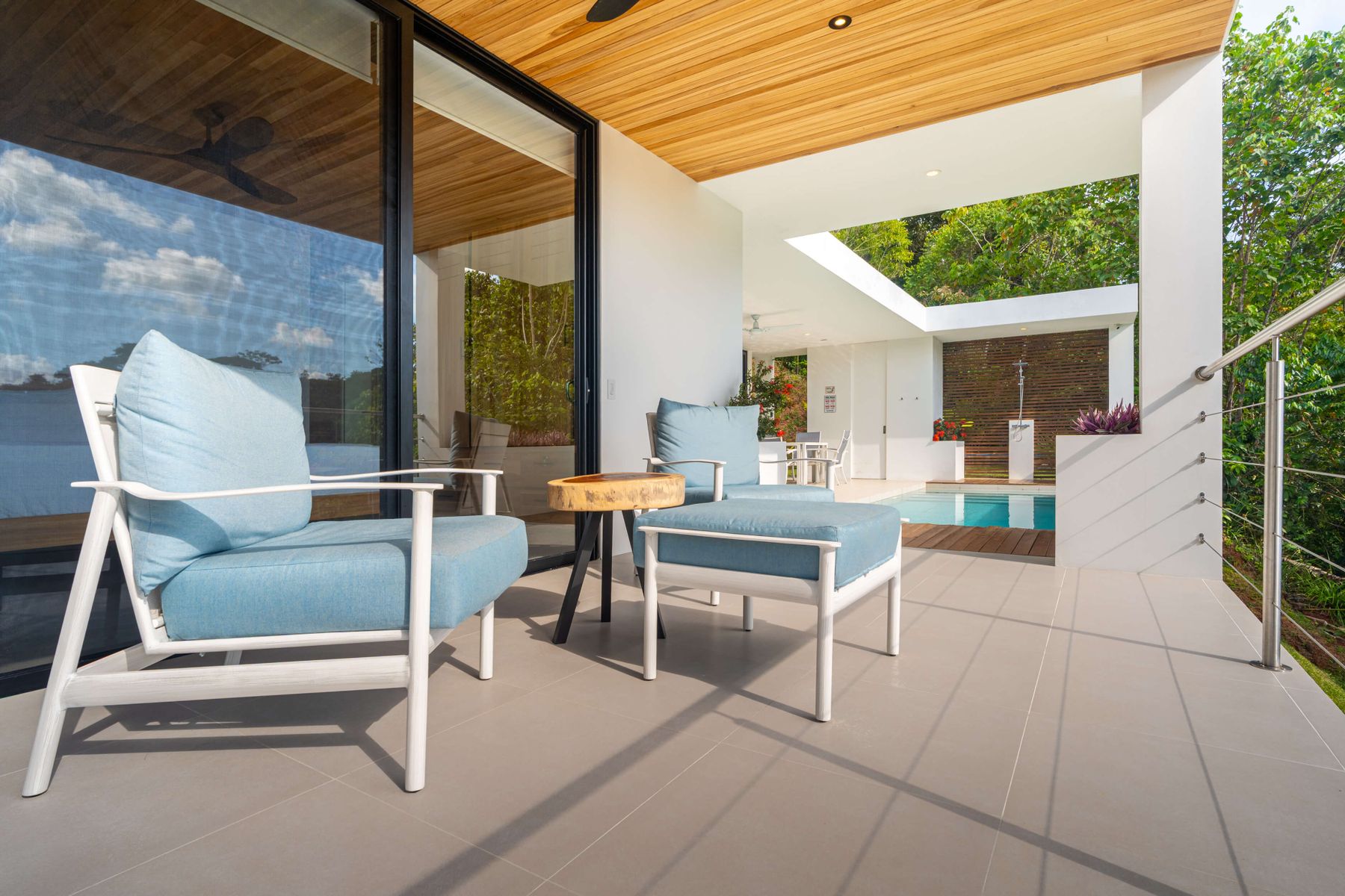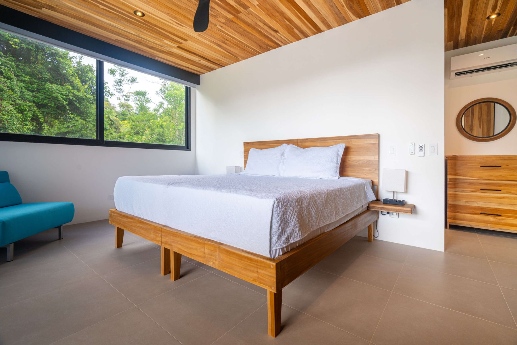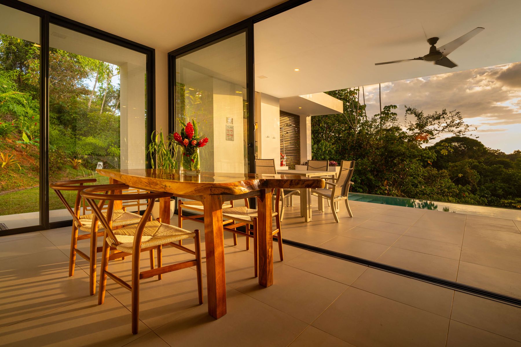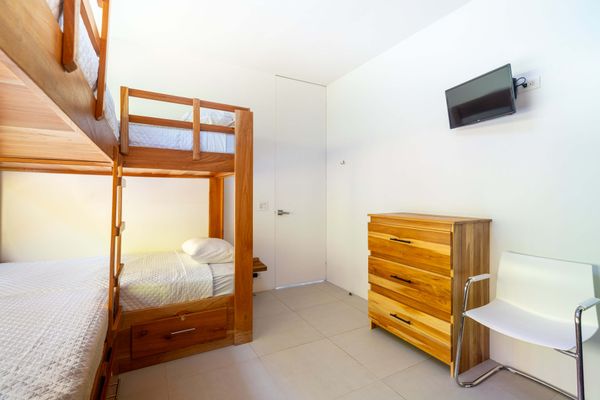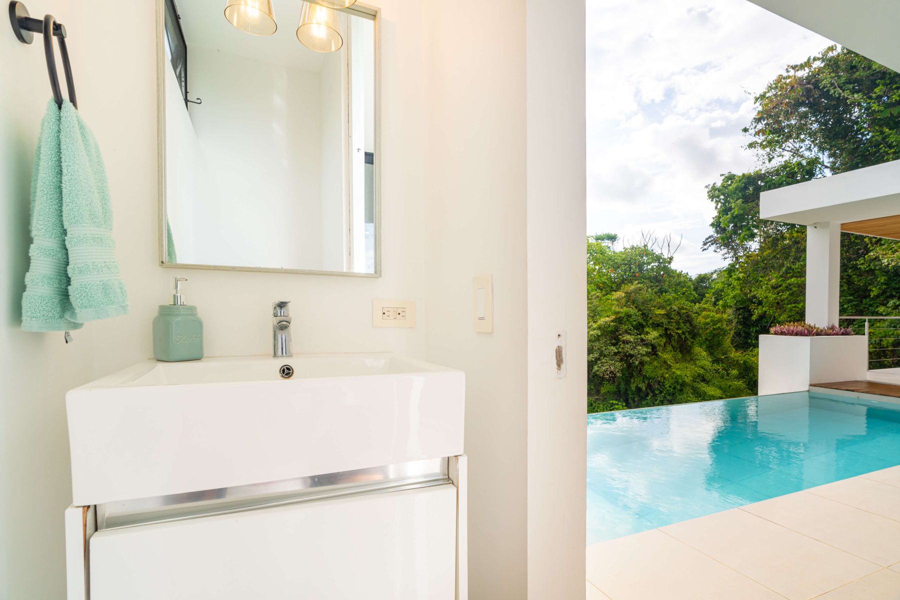 Each bedroom includes air conditioning for comfort. The open living area flows directly to the outdoor terrace where guests can enjoy two beautiful infinity pools, perfect for relaxing and cooling off while surrounded by jungle and mountain views.