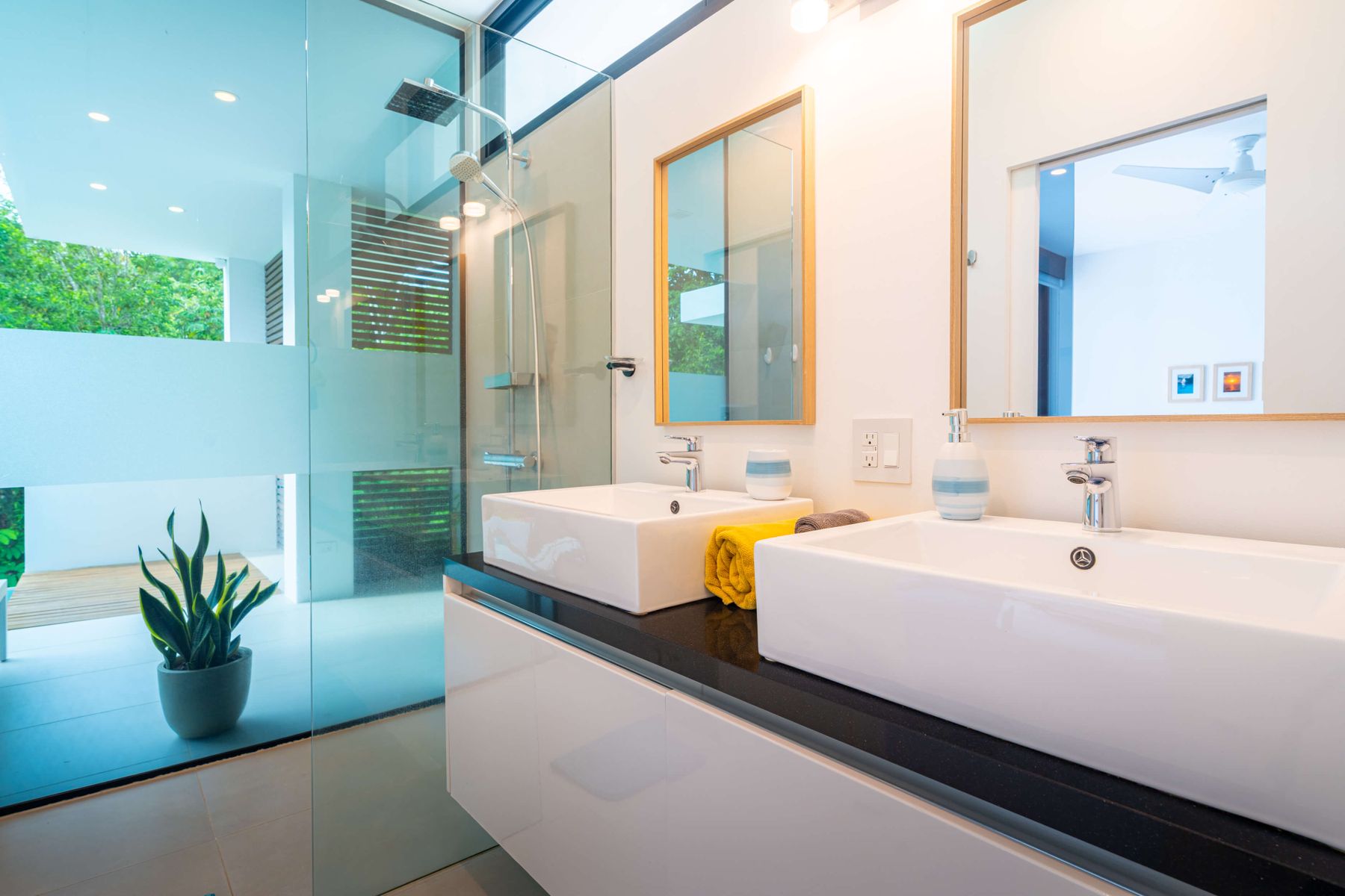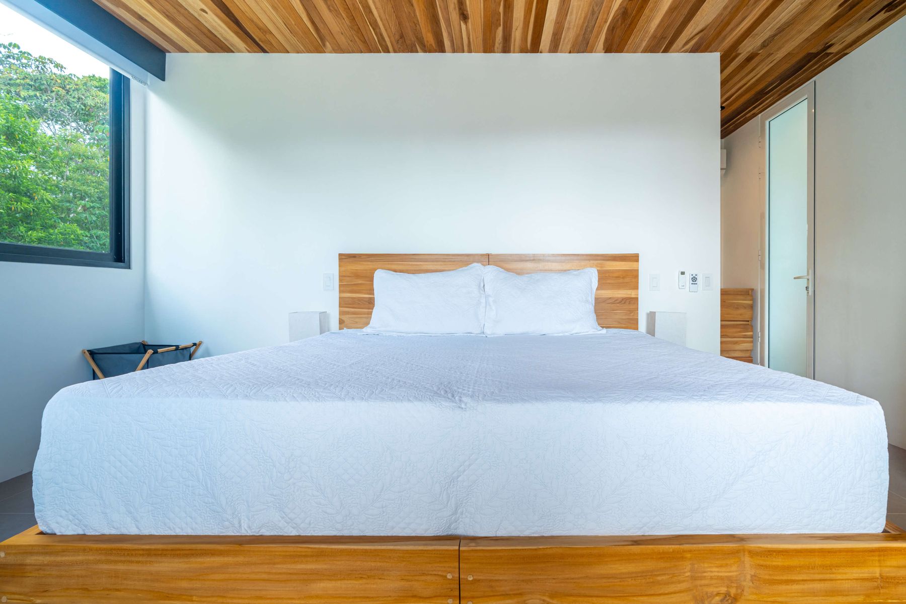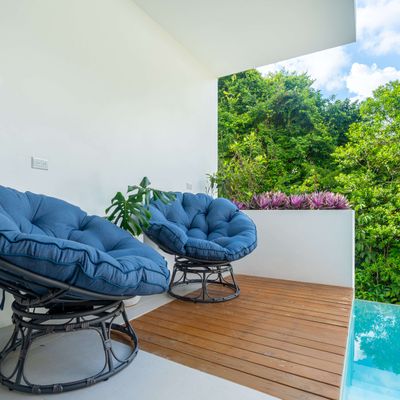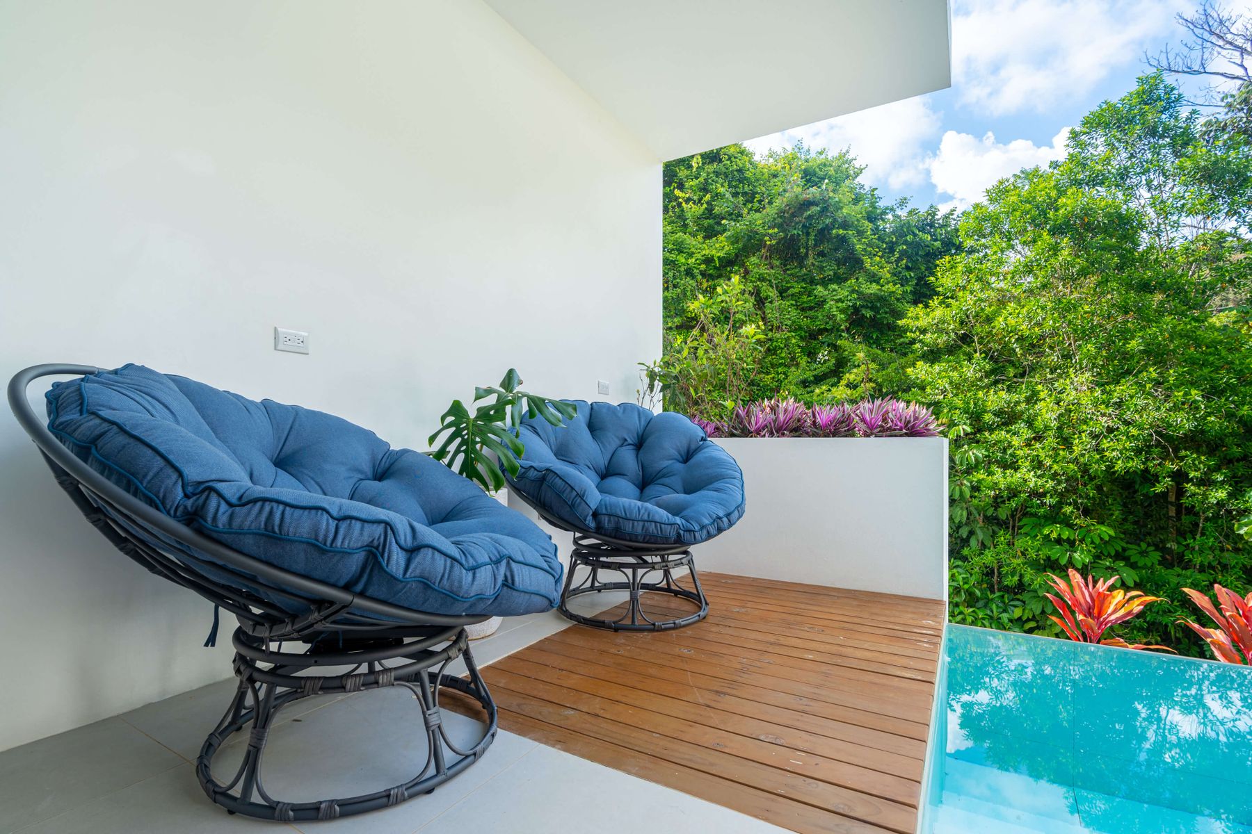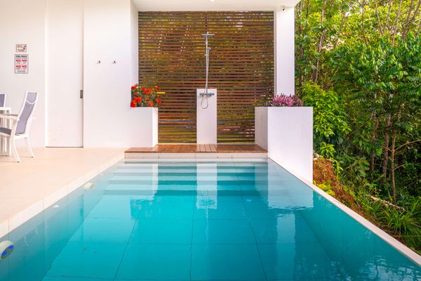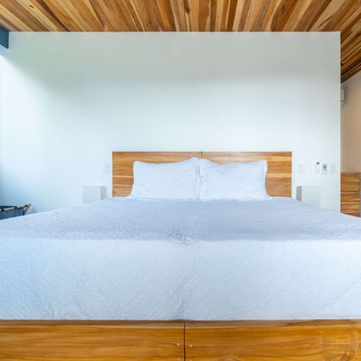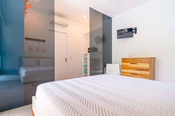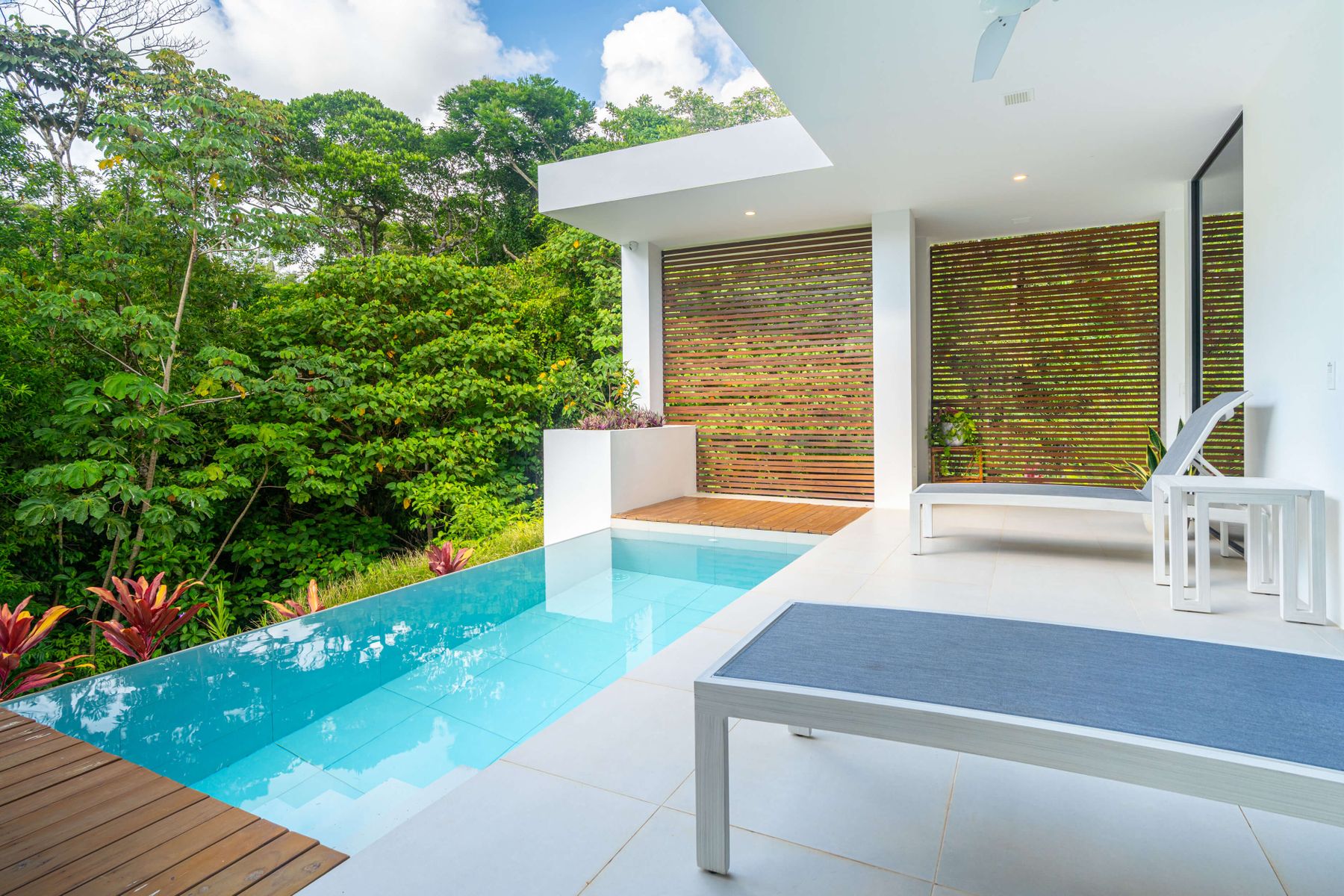 Each bedroom includes air conditioning for comfort. The open living area flows directly to the outdoor terrace where guests can enjoy two beautiful infinity pools, perfect for relaxing and cooling off while surrounded by jungle and mountain views.