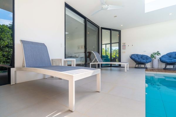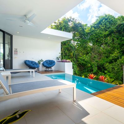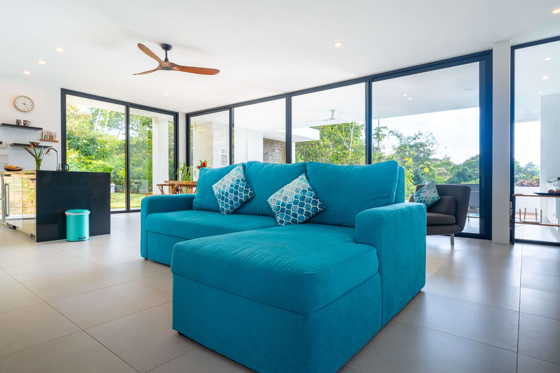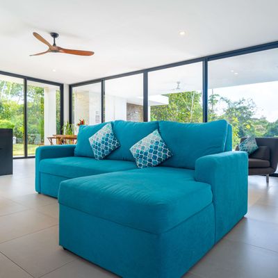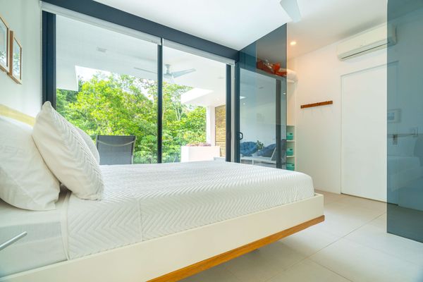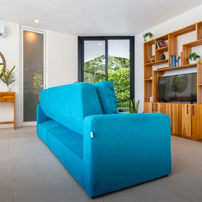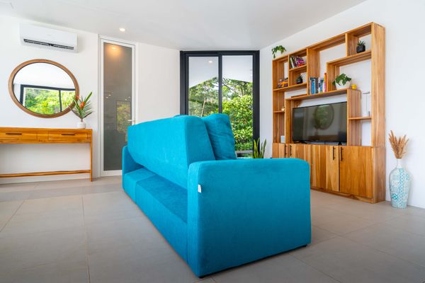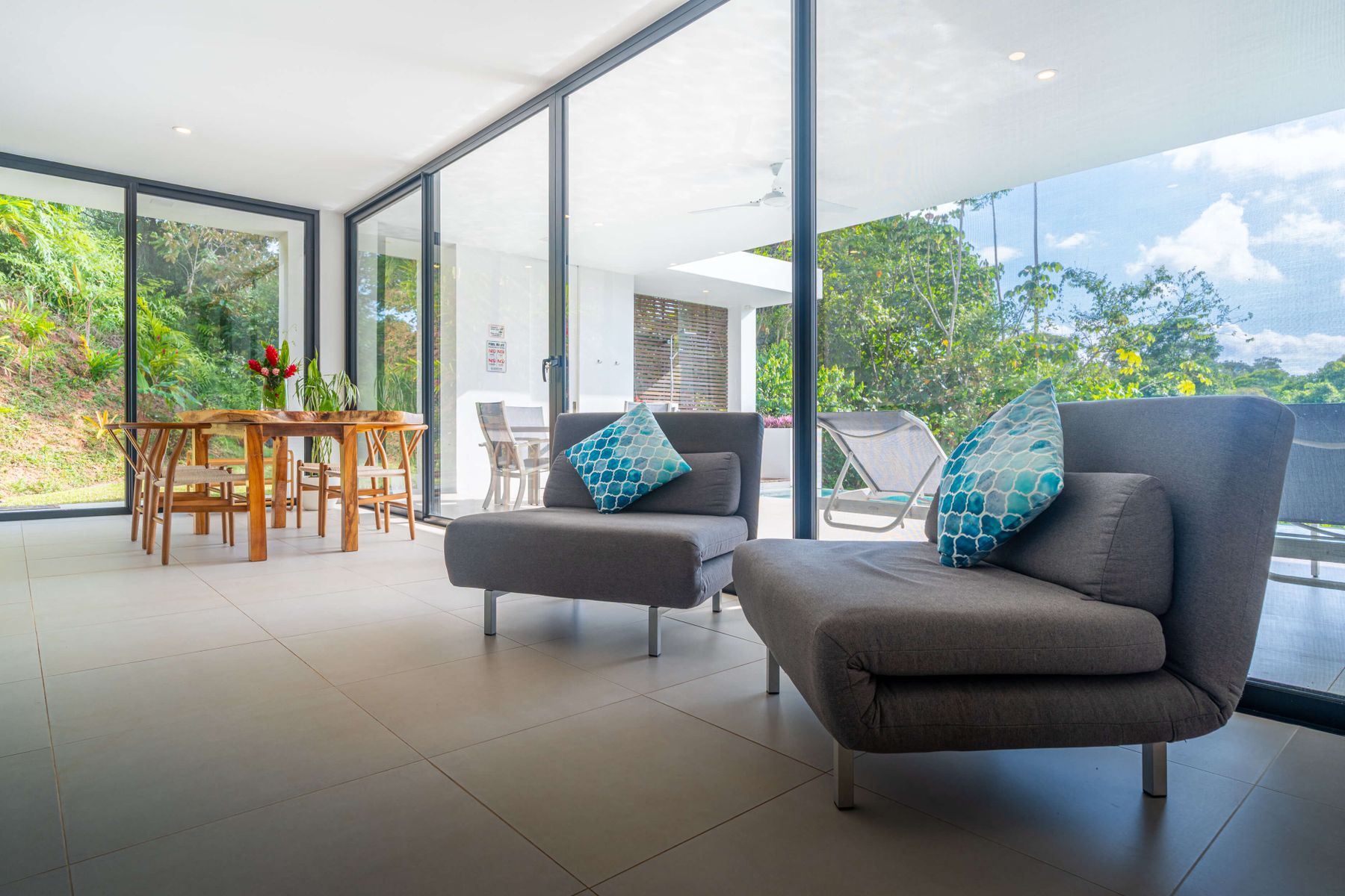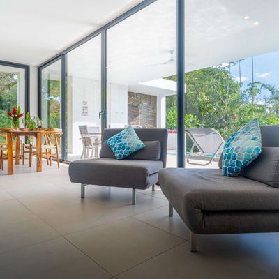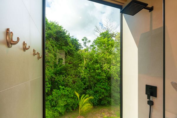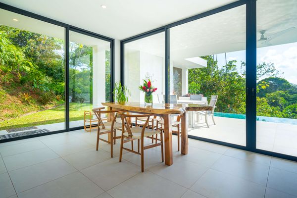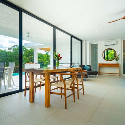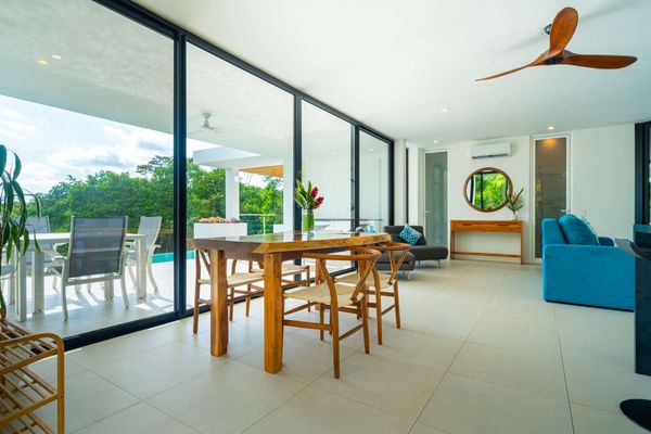 The villa was designed with a modern architectural style, large windows, and open living spaces that connect seamlessly with the surrounding tropical forest. Natural light fills the interior while the surrounding landscape creates a quiet and secluded atmosphere.