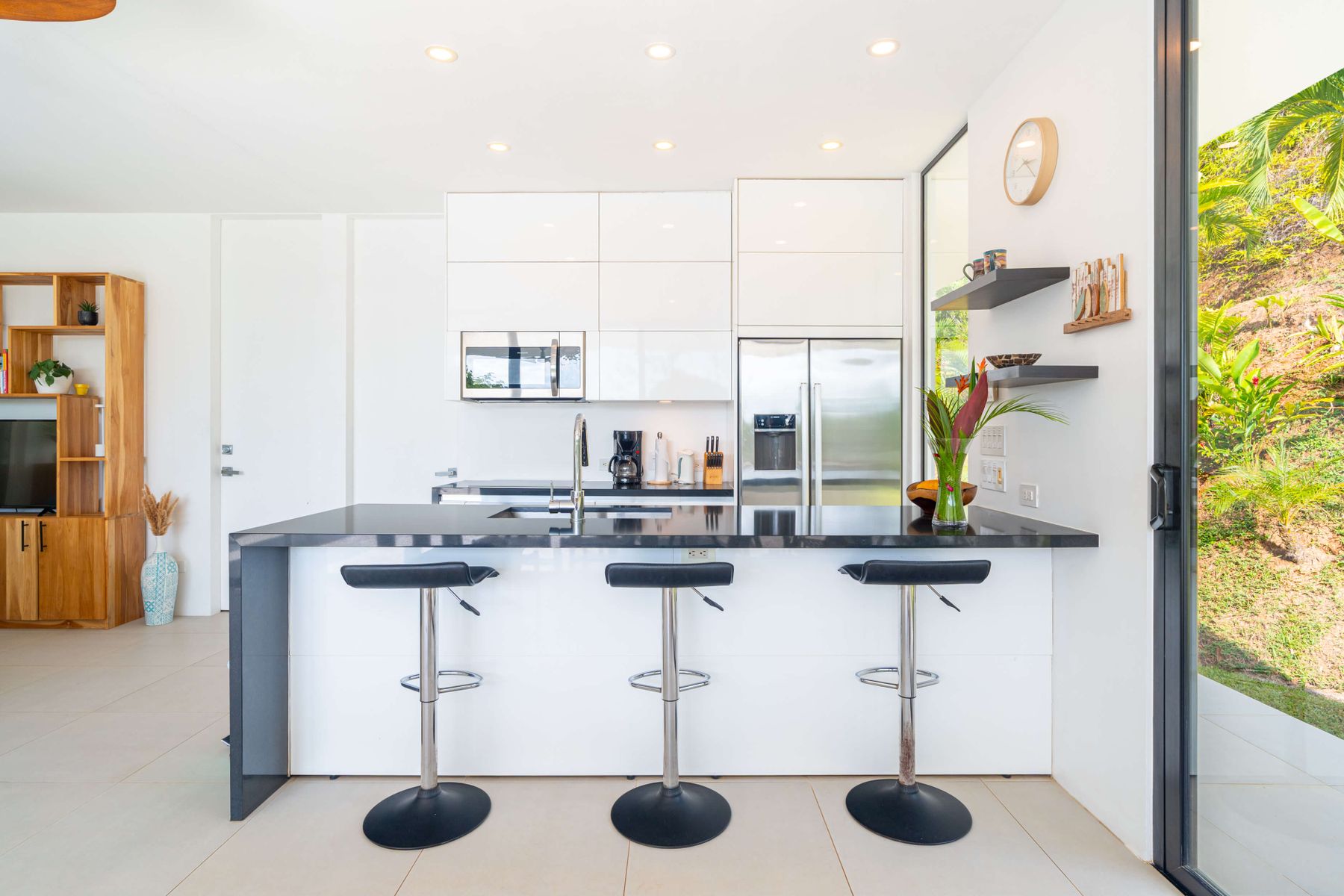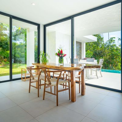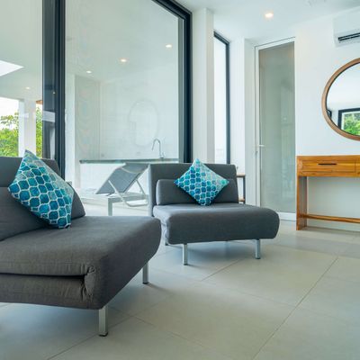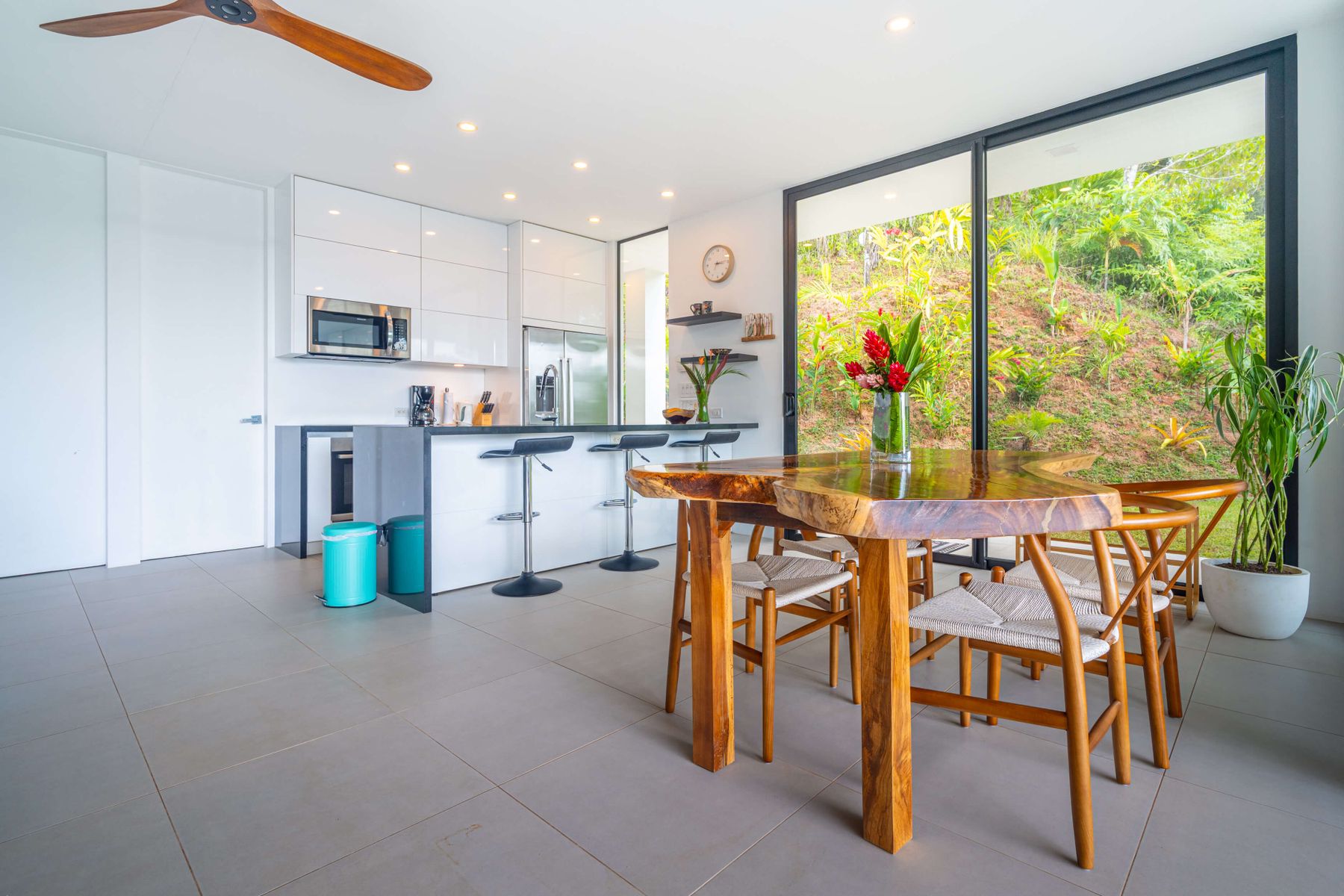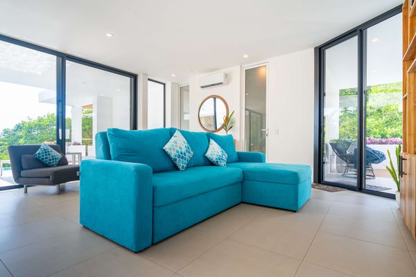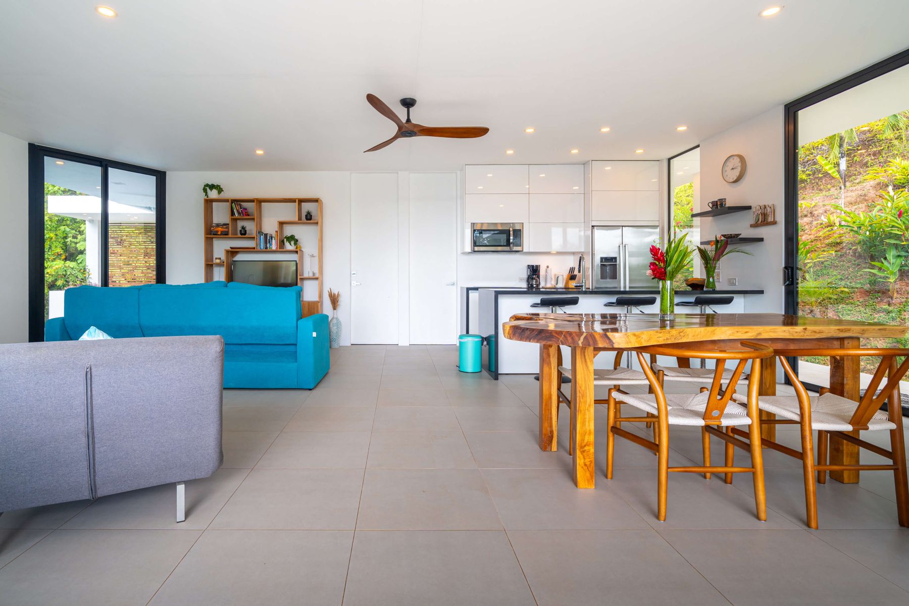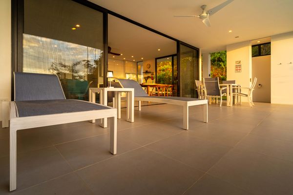 The villa was designed with a modern architectural style, large windows, and open living spaces that connect seamlessly with the surrounding tropical forest. Natural light fills the interior while the surrounding landscape creates a quiet and secluded atmosphere.