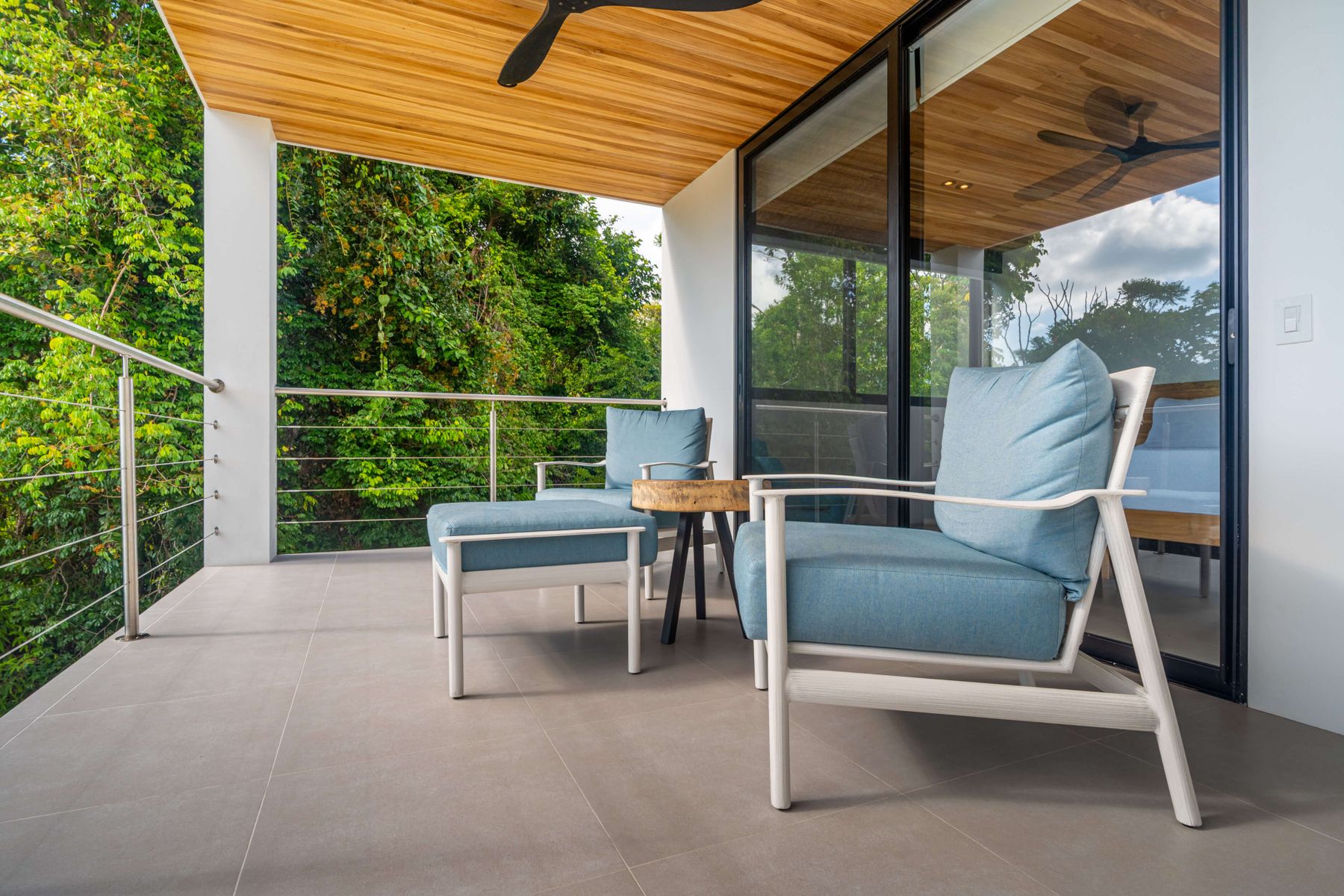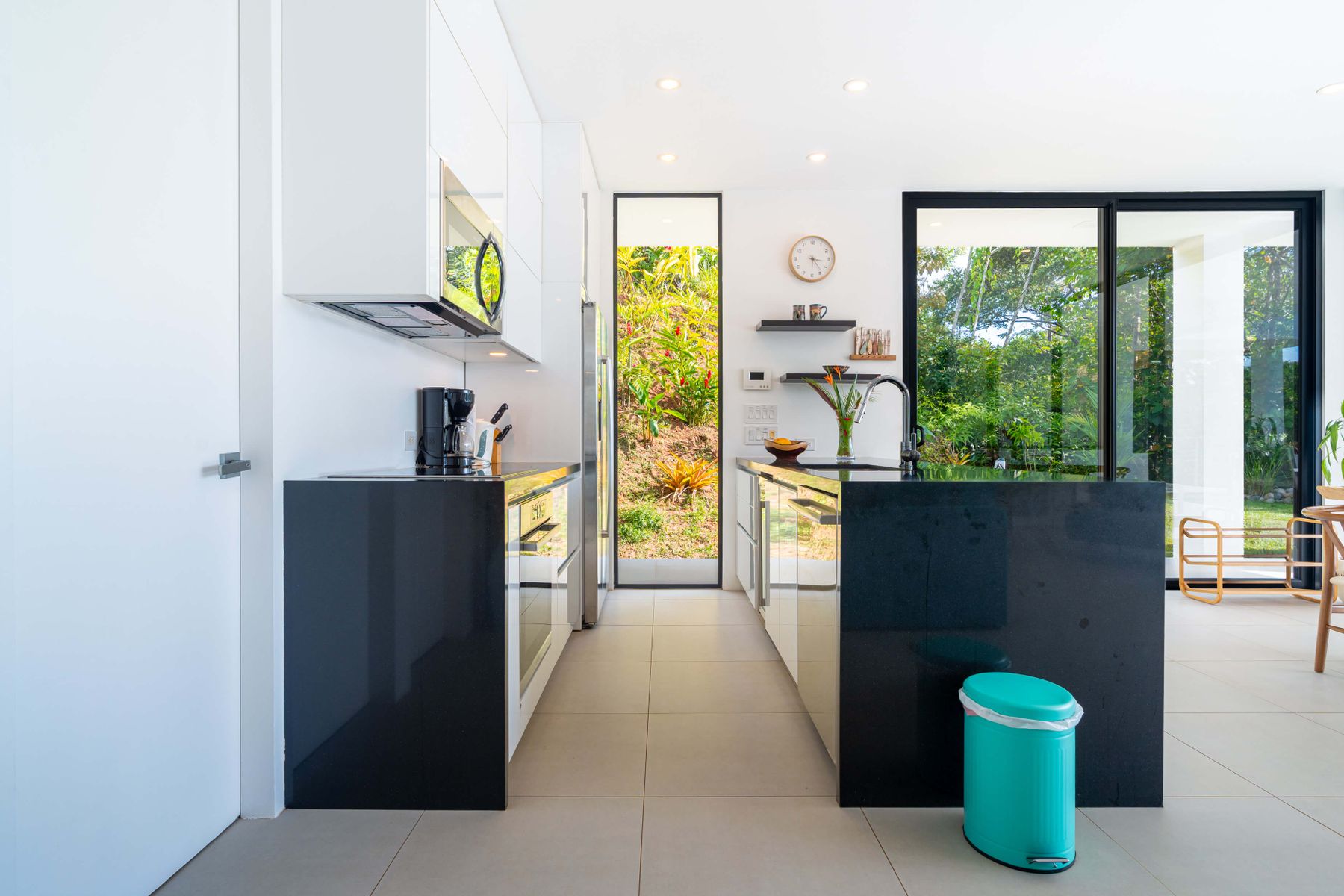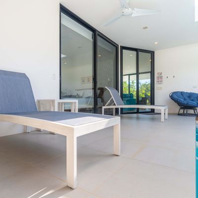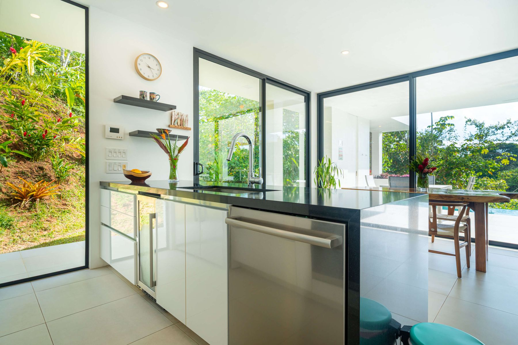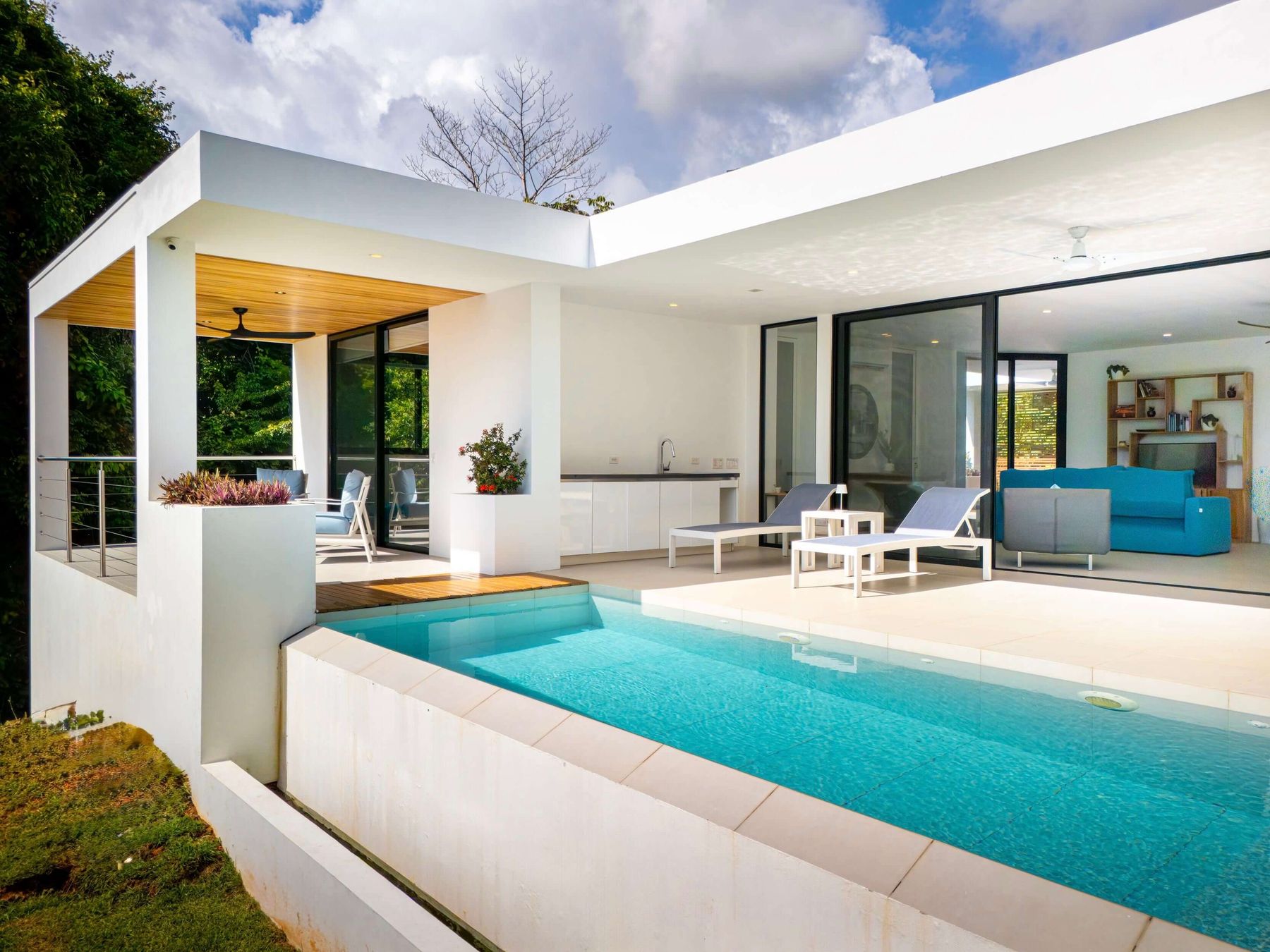 The villa was designed with a modern architectural style, large windows, and open living spaces that connect seamlessly with the surrounding tropical forest. Natural light fills the interior while the surrounding landscape creates a quiet and secluded atmosphere.