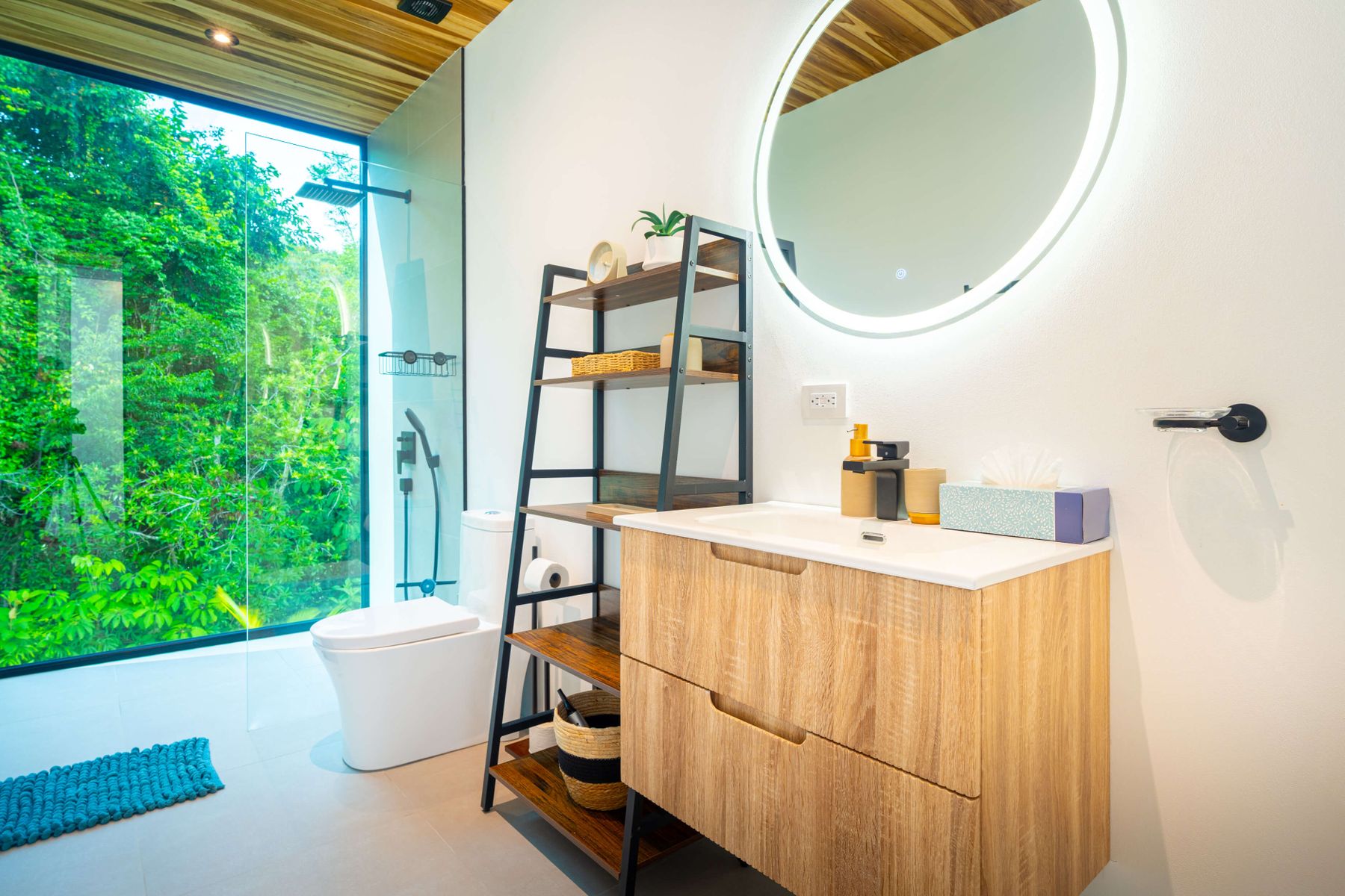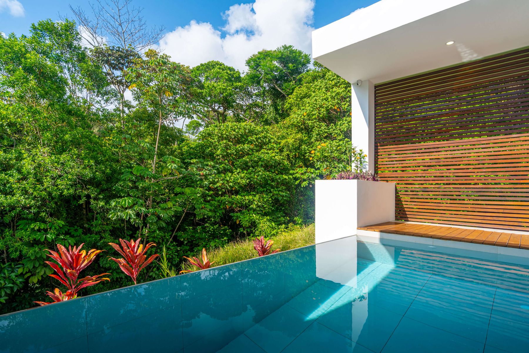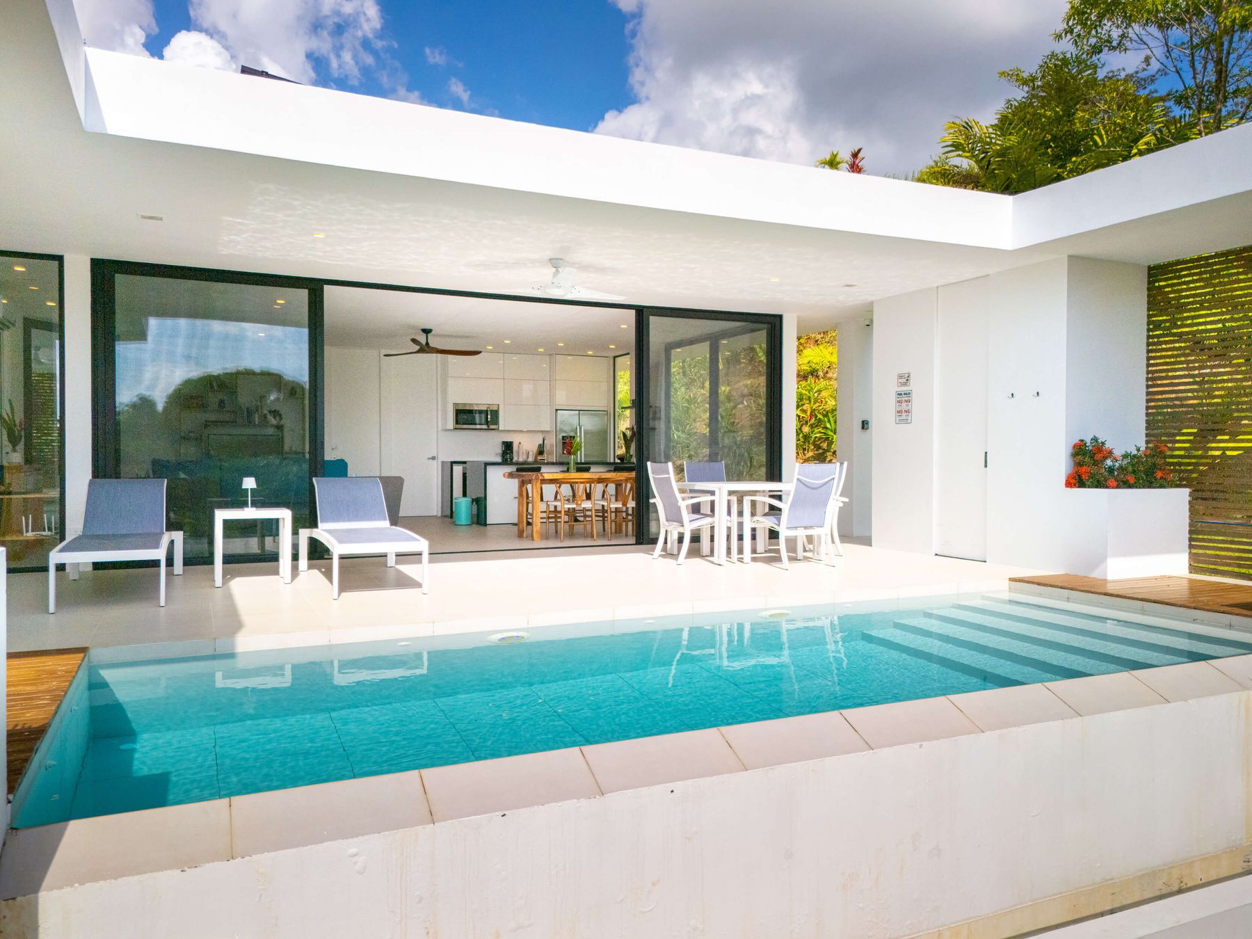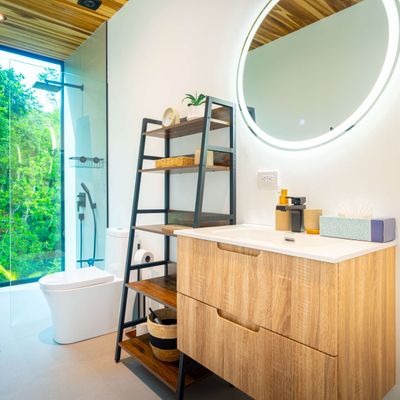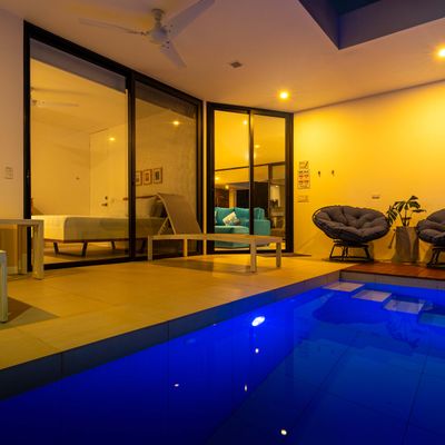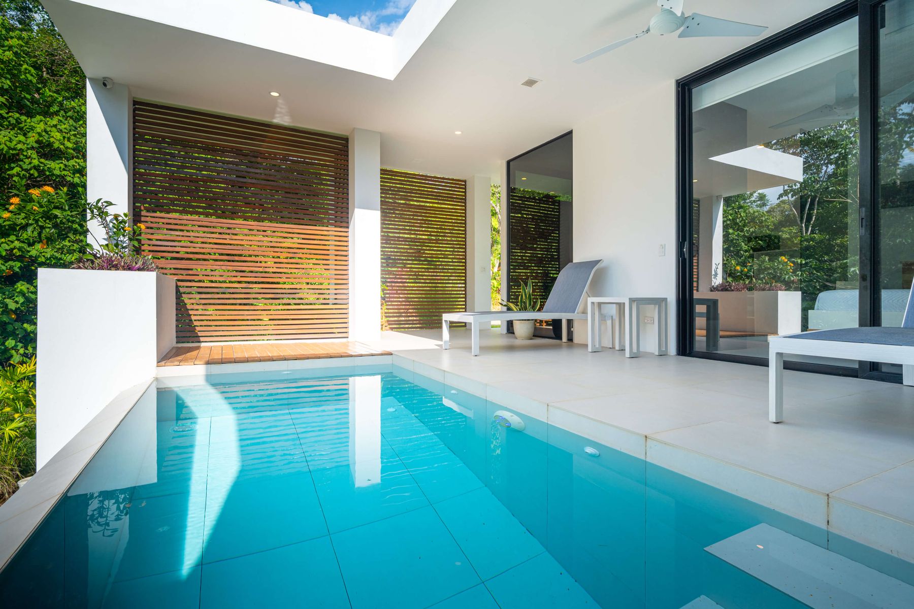 The villa was designed with a modern architectural style, large windows, and open living spaces that connect seamlessly with the surrounding tropical forest. Natural light fills the interior while the surrounding landscape creates a quiet and secluded atmosphere.