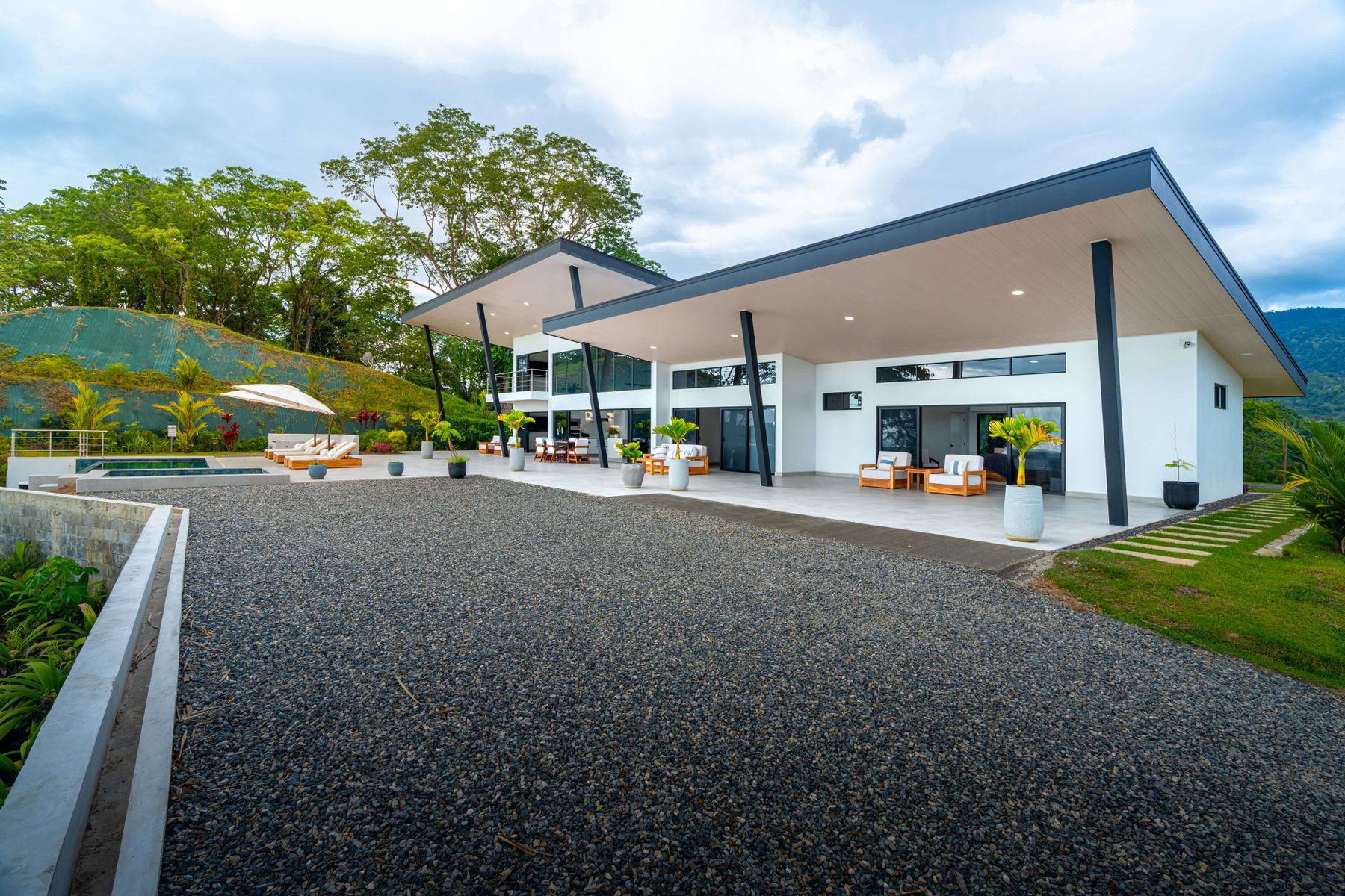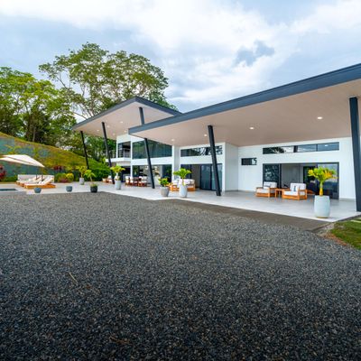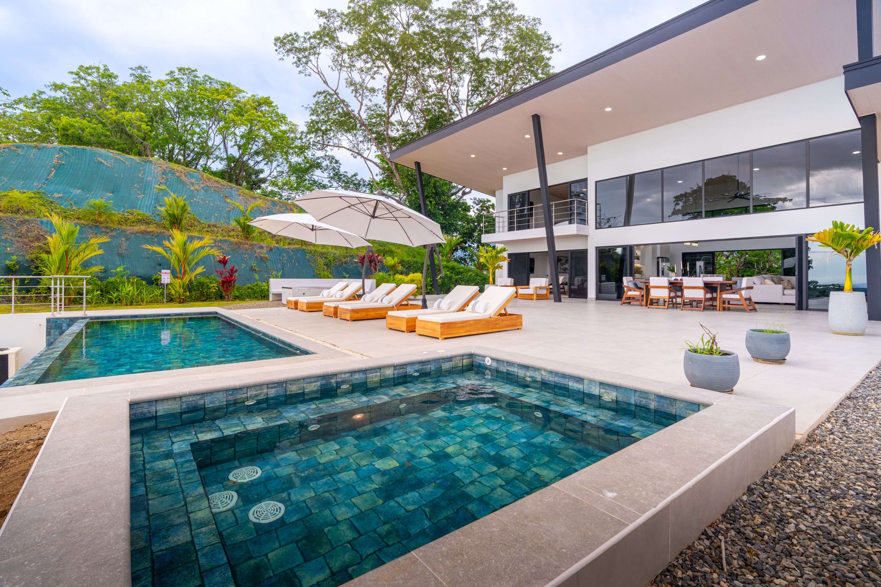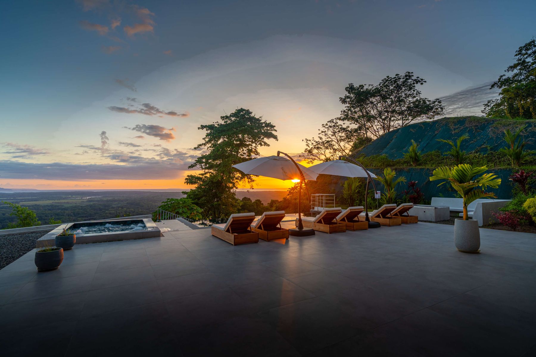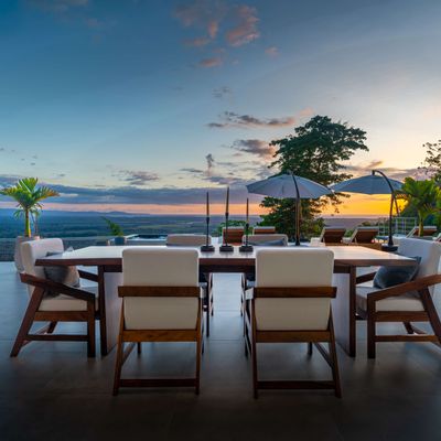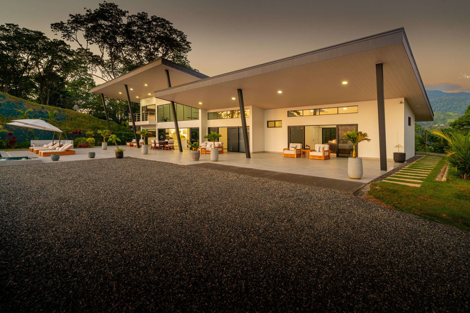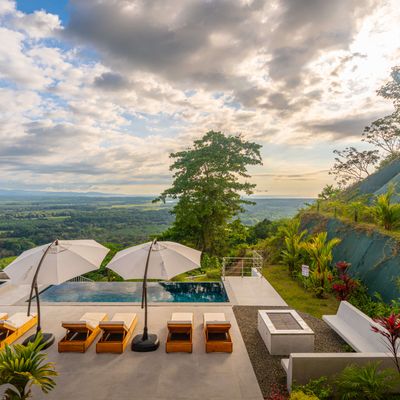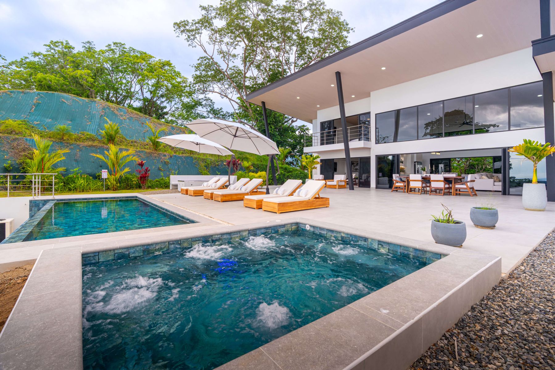 Modern luxury villa sits high in the hills offering sweeping views of rainforest, rolling valleys, and the distant Pacific Ocean. Clean lines, high ceilings, and floor-to-ceiling glass create bright, open spaces that flow directly to the terrace and infinity pool—perfect for relaxing and enjoying unforgettable sunsets.