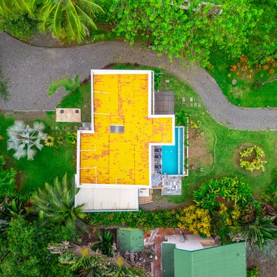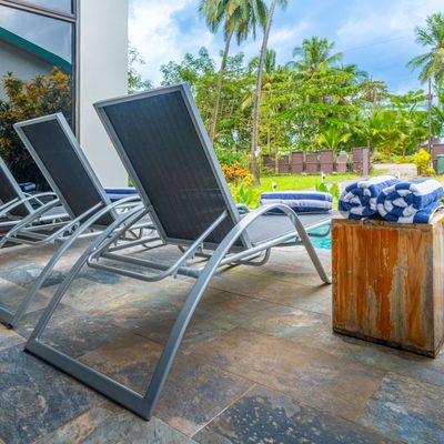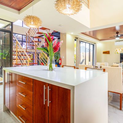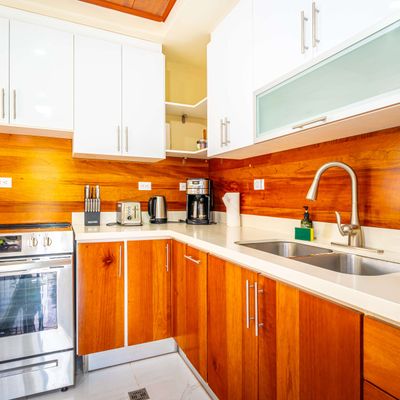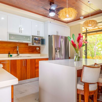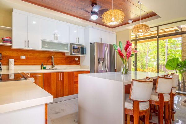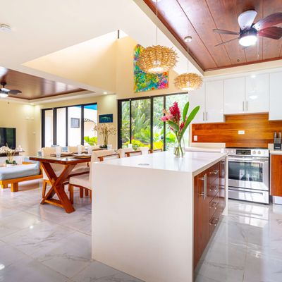 This tropical retreat offers modern comfort with a fully equipped kitchen.